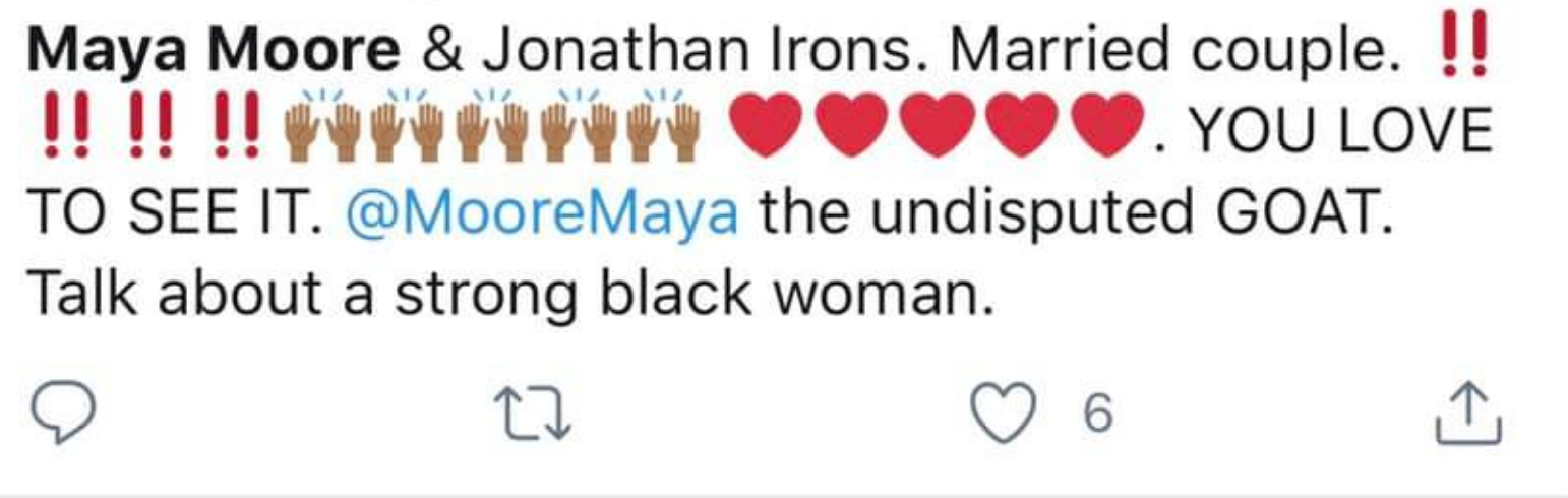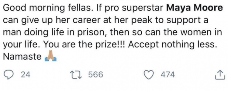 Another entry in this lesson in marrying down is Maya Moore. Maya is a talented WNBA player who paused her lucrative career to free her wrongfully convicted now-husband, Jonathan Irons.
