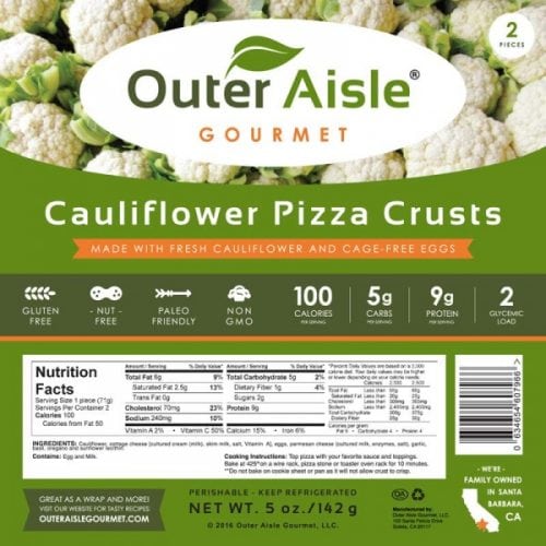 “Delicious pizza crust made from fresh cauliflower, parmesan cheese, clean label cottage cheese, eggs, basil, oregano, garlic and sunflower lecithin. Naturally gluten-free, low carb, low calorie, no flour, no nuts and no soy. No artificial ingredients. 2 servings of vegetables in each piece. Naturally delicious!”