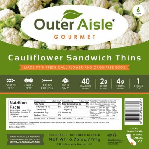 “A delicious bread substitute made with fresh cauliflower, parmesan cheese, clean label cottage cheese, egg whites and sunflower lecithin. Naturally gluten free, low carb, low calorie, no flour, no nuts and no soy. No artificial ingredients. 1 serving of vegetables in each piece. Simply delicious!”