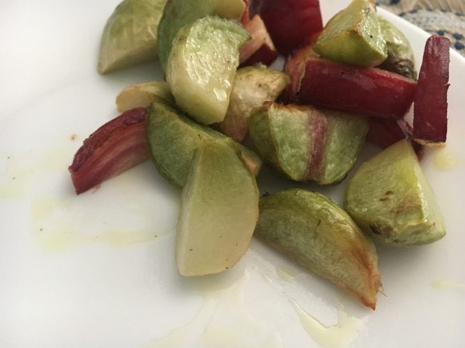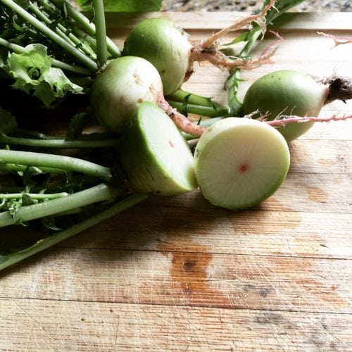 Chinese Red Meat radish! I’m going to be honest–I’m not a huge fan of radish, but I grow it because my German mother-in-law loves them. However she’s been remiss in getting her share so I have a pretty robust harvest that needs to be plucked. This particular variety starts off sweet and finishes off super hot when it’s raw. But when you roast them…the heat disappears and the sweet, earthiness remains. I roasted these radishes with a random beet I saw hiding amongst the Swiss chard, it looked like this…