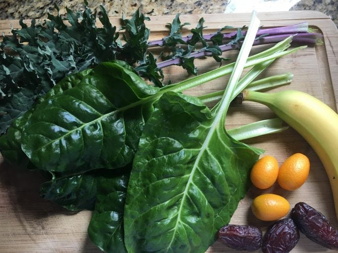 The Swiss Chard, kale and kumquats are ready for picking, so I made a green smoothie with the items above along with a vanilla-flavored protein powder. Okay so I cheated; the dates and bananas weren’t from my garden. Kale and chard work to detoxify the liver, banana lends potassium, kumquats are bursting with vitamin C, and dates are just…yummy. Dates are loaded with sugar, but it’s the natural kind, and all the fiber mediate the sugar surge. I was planning to have a pretty intense workout so I knew those carbs would be well spent.