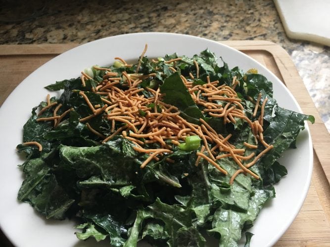 Then on the side, a had a kale slaw, made from carrots, kale, cilantro, mint, and scallions I’ve been growing. I added some raisins, mayo, and topped with some crunchy rice noodles.