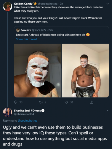 Basically, a Black man decided to start a thread for fellow black men doing skin care. My girls decided to roast him a new one. I personally disagreed with that method, and shared my thoughts with the ladies. Was the man in the photo attractive? Not to me, but that really was not the point of the thread, in my opinion. I could see that he is trying to do something to improve himself and his brothers. I was satisfied with the fact that he is not warming my bed at night, and eventually, if some black woman took him up, she would not have to deal with a man allergic to basic skincare.