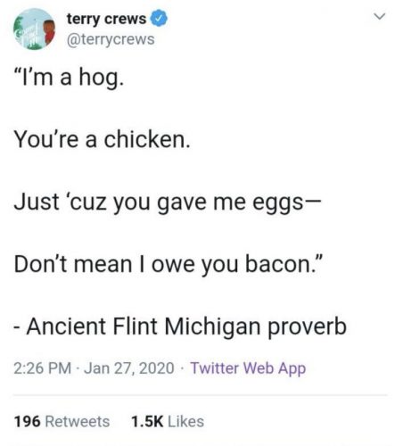 The blog recently discussed the situation with Terry Crews, where he failed to support Gabrielle Union’s claims against America’s Got Talent, even as she was one of the many who supported him in his sexual assault claims. She gave an excellent critique there, so I will not belabour the point. It boggles my mind that people always gassed him up being so attractive (reading THIRST TWEETS!!! on Buzzfeed) and offering him so many opportunities, when he legit looks like Killer Croc from Gotham and is basically a one-trick pony on-screen. While the statement above was shocking, his Flint Michigan proverb really took the cake for me.