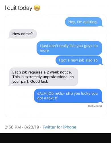 Not because you leave an employer means you can never go back. If you leave on good terms, usually you should be eligible for rehire, especially if you find out the ship you jumped to wasn’t quite the ride you expected. Additionally, it helps to stay in touch with a handful of close work pals. I’m an older millennial (80s baby, 90s made me, as the kids say), and I’ve had close to 10 jobs since entering the workforce all those years ago. Out of all my previous employers, I am still in regular contact with at least one person from 5 of them, and I am eligible for rehire at all of them. You never know who might have a connection at your dream job, or remembers you enough to write a glowing letter of recommendation. Just make sure this is NOT the way you part ways: