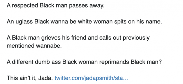 Snoop is out here protecting the legacy of a dead man, meanwhile his own legacy, fraught with a visceral hatred of black women, is up for debate. Not because he has a black wife means he doesn’t hate black women. His entire body of work, and his treatment of his black wife, shows this. This is the same male who apparently doesn’t have a will, because “I don’t give a fuck when I’m dead. What am I gonna give a fuck about?”. The widow here is fine and does not need his lackluster “protection”, especially when his own house (as of 2016, anyway), doesn’t seem to be in order.