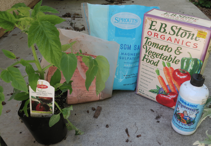 Before I transplant the tomato, I dig a hole twice the width of the pot and sprinkle some organic fertilizer, epsom salt, and rock minerals at the bottom to feed the roots. I then water it in with Neptune’s Organic Fish and Kelp Fertilizer. Finally, I top dress with my homemade compost that the worms have pooped their precious castings all winter. I probably won’t have to feed this plant again until it starts to set flowers.