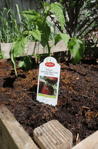 After I brought home the tomato, I planted it in one of the raised beds with my magic formula for growing delicious and robust fruits.