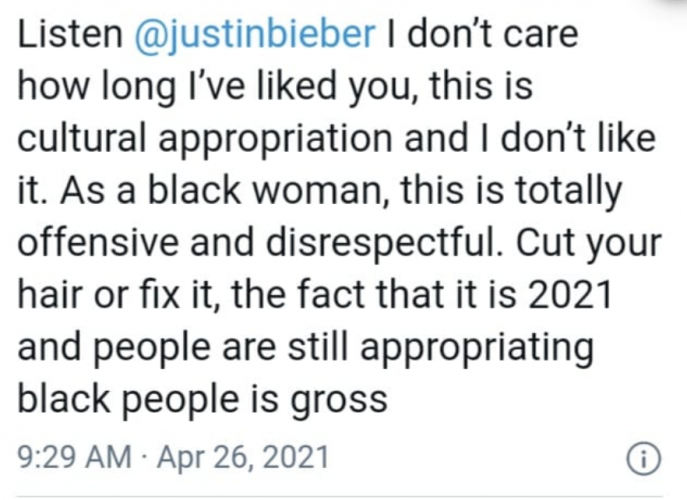 As expected, social media lit up with declarations of how this was offensive, and yet another incident of cultural appropriation. This is not his first hair-related kerfuffle, as something similar happened back in 2015, too. And even more expected, it was black women leading the charge in comment sections taking him to task for his questionable hair style. In fact, even CNN made mention of this in their article covering this, saying “On social media some Black women called Bieber’s hairstyle offensive and disrespectful and urged him to change it and apologize.”
