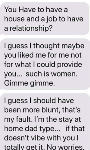 Case in point, the story of a woman who went out on a date with a dude, and when she called him out for not being stable and rightfully kicked him to the curb (ie: didn’t have a fixed address, he told her women were too “gimme gimme”, failing to see irony.