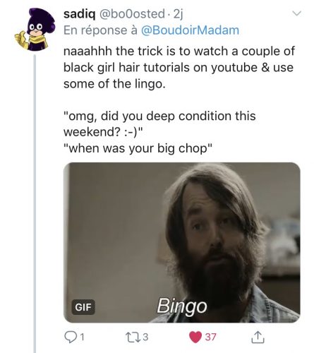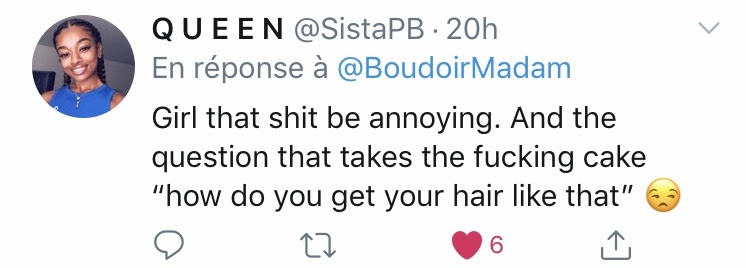 Not everyone is comfortable sharing about their hair journey publicly, particularly when they may have to admit that not all of the hair sitting on their head grows out of their scalp. Some people use that tactic as a way to make black women feel less than, so it is not well received. I would also caution against any unwanted touching or even requests to touch the hair. To be safe, do not ask to touch the hair unless you all are intimately involved. Even then, you may not get permission, but roll with it.