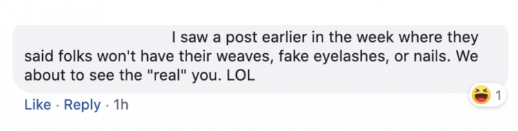 The fact that so many women showed up to criticize my post shows that weave (and relaxing, which, interestingly enough, I didn’t even bring up once, but people ran to defend…hmm) is indeed an integral part of black women’s preparation plans. It is, in fact, that serious. Black women are out here praying that their state won’t shut down, not because of interruptions to their everyday routine, but because of their hair appointments. And maybe Becky and Priya and Ming Lee are in their respective spaces discussing this, I don’t know. But it doesn’t matter to me because 1) I don’t share a race with them and 2) they are not scrambling to place hair textures of black women sourced from a region known to be struggling with the coronavirus onto their heads amidst a global crisis.