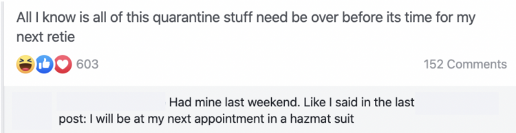 In loc groups, there have been MULTIPLE women (and a few men!) posting about how they don’t care what quarantine they are under, they are still getting their retwist done.