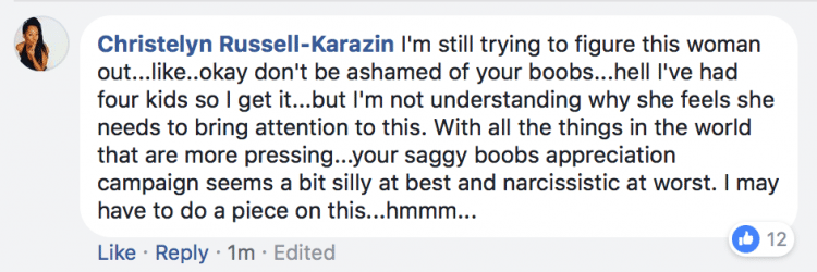 Yes. With all the things going on in the world, Chidera Eggerue wants YOU to know that saggy boobs matter. Apparently, this member of the perpetually triggered Millenial generation wants to call attention to the alleged pressure she feels to have perky boobs.
